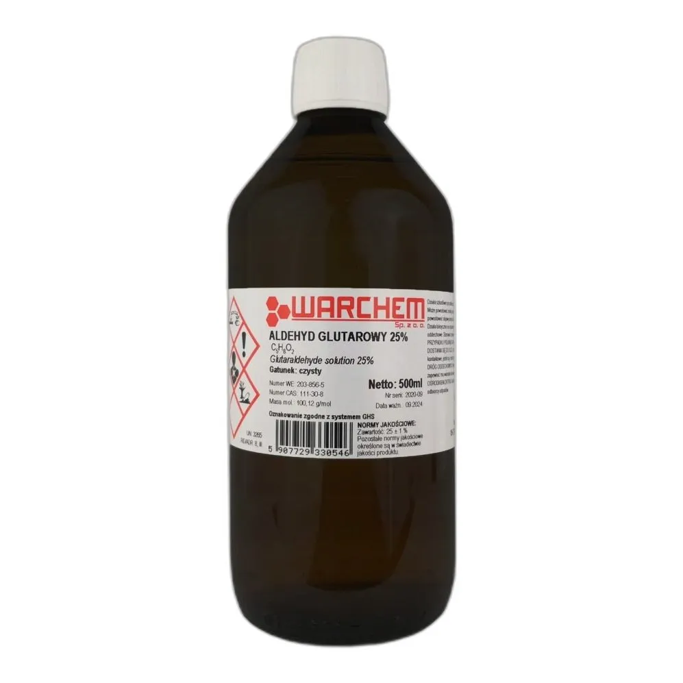 Roztwór 25% jest już rozcieńczony w wodzie i gotowy do użycia. Łatwo miesza się z wodą i alkoholem. Reaguje z aminami i białkami, co powoduje ich utwardzenie. Czy wiesz, że aldehyd glutarowy może zapobiegać rozkładu tkanek w preparatach biologicznych?