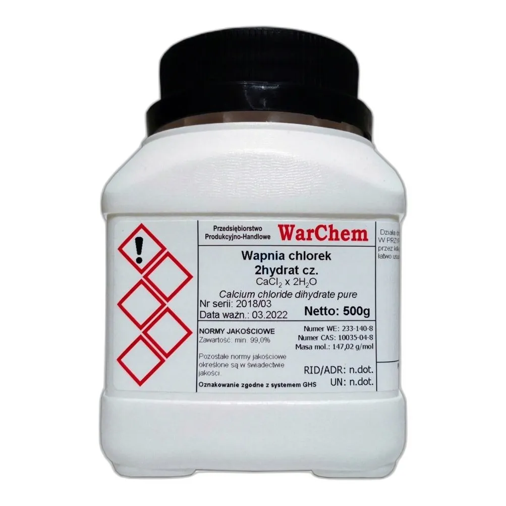Chlorek wapnia dwuwodny do zastosowań technicznych i laboratoryjnych (CaCl2) powszechnie znana jako sól wapniowa kwasu solnego to odczynnik chemiczny przeznaczony wyłącznie do zastosowań laboratoryjnych, badawczych i profesjonalnych.