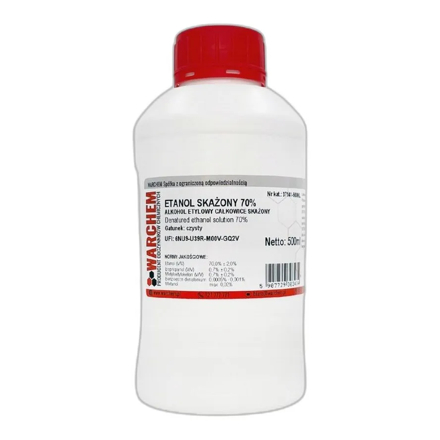 Etanol skażony o stężeniu 70%, forma płynna, pojemność 500 ml. Nadaje się do dezynfekcji i prac laboratoryjnych.