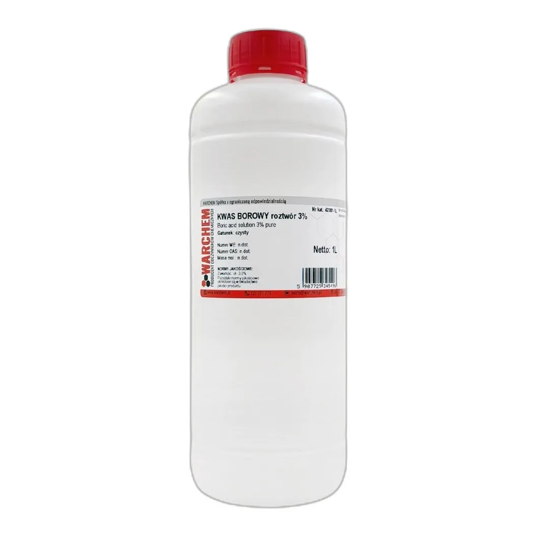 Wodny roztwór kwasu borowego o stężeniu 3% w objętości 1000 ml. Substancja chemiczna do zastosowań technicznych i czyszczenia. Wzór H₃BO₃.
