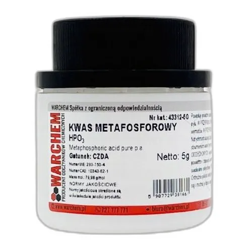 KWAS METAFOSFOROWY (HO3P) to odczynnik chemiczny przeznaczony wyłącznie do zastosowań laboratoryjnych, badawczych i profesjonalnych.
