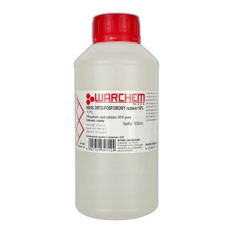 Roztwór 50% H₃PO₄, 500 ml w butelce PE. Waga netto: ok. 600 g. Przechowywać w miejscu suchym, z dala od światła i substancji alkalicznych. Temperatura magazynowania: od +5°C do +30°C. Unikać kontaktu z metalami aktywnymi.