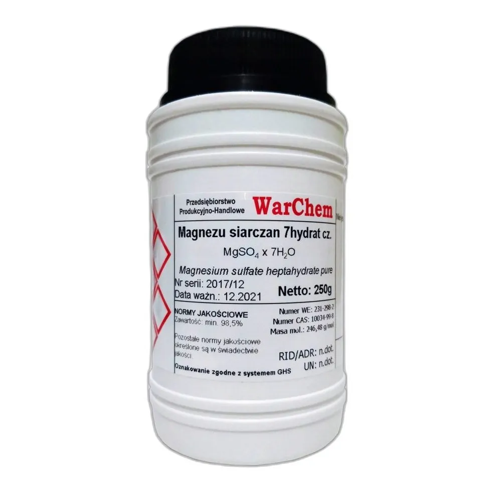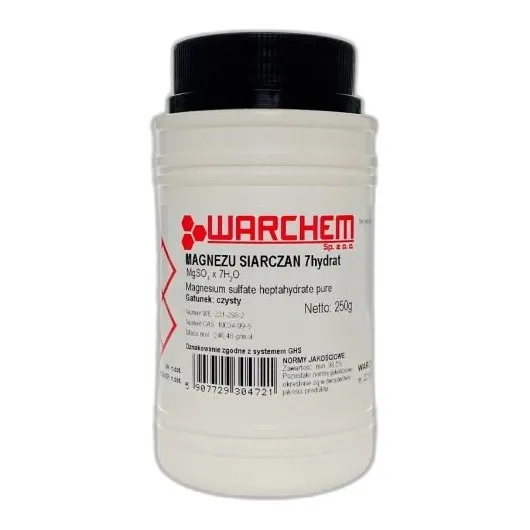 SIARCZAN MAGNEZU 7hydrat (MgO4S) powszechnie znana jako sól epsom, sól gorzka, sól angielska to odczynnik chemiczny przeznaczony wyłącznie do zastosowań laboratoryjnych, badawczych i profesjonalnych.