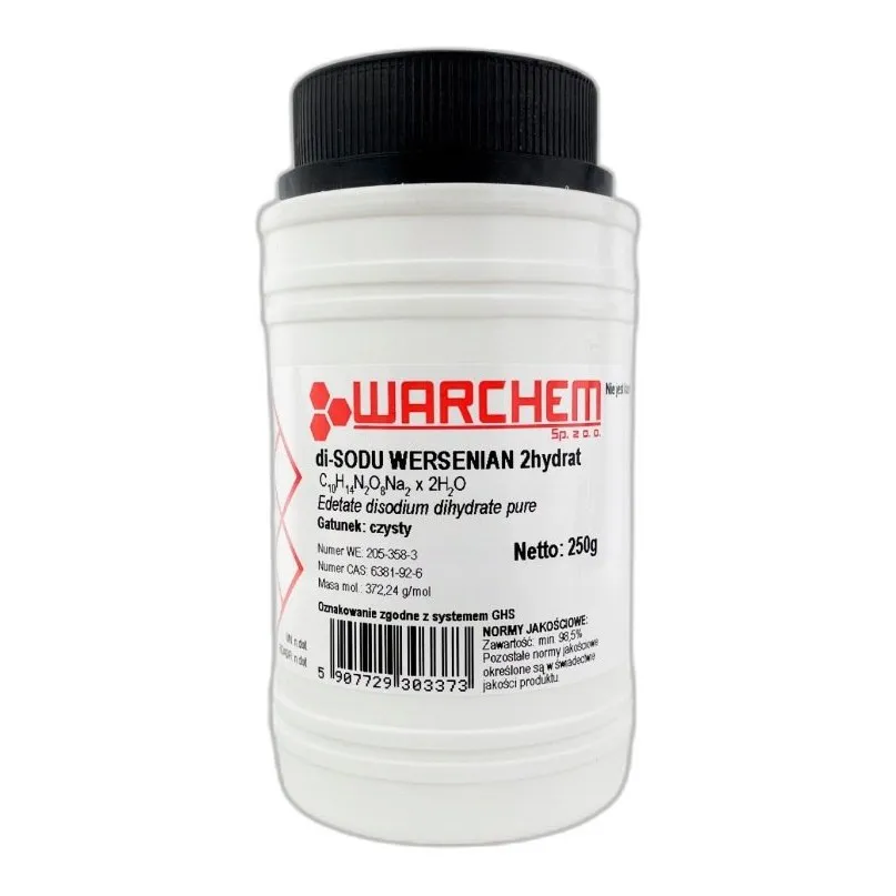 Wersenian dwusodowy (EDTA) to sól stosowana w analizie chemicznej i przemyśle. Wzór: C₁₀H₁₄N₂Na₂O₈. Czystość 98,5%.
