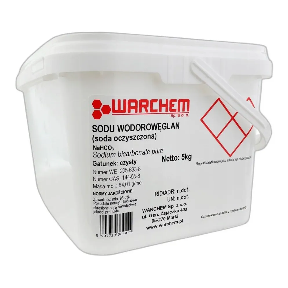 Substancja wodorowęglan sodu jest jednoznacznie identyfikowana przez numer CAS 144-55-8, wzór chemiczny CHNaO3, nazwa łacińska Natrii hydrogenocarbonas. Powszechnie znana również jako: soda oczyszczona, soda do pieczenia. Te identyfikatory pozwalają zweryfikować autentyczność produktu w międzynarodowych bazach chemicznych takich jak PubChem (NIH/NLM) oraz Common Chemistry (CAS). Każda partia produktu opatrzona jest dokumentacją zgodną z wymogami REACH (WE) nr 1907/2006.