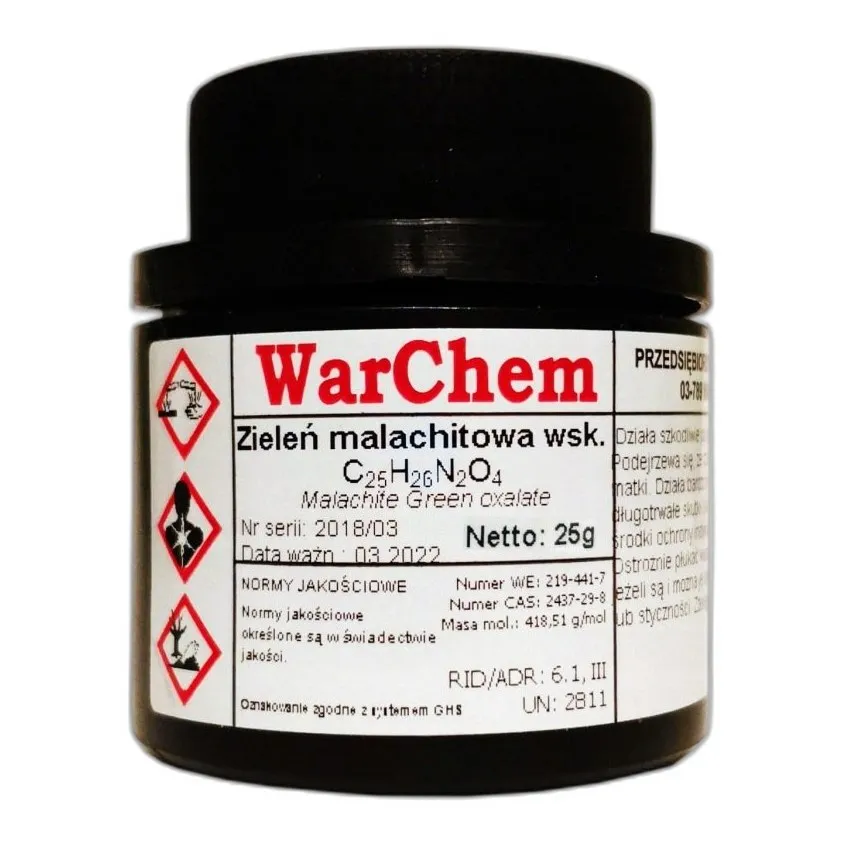 ZIELEŃ MALACHITOWA WARCHEM [60954] (C23H25ClN2) to odczynnik chemiczny przeznaczony wyłącznie do zastosowań laboratoryjnych, badawczych i profesjonalnych.